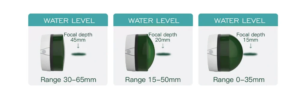 - Adjustable Penetration Depth – Treatment depth can be adjusted by changing the water level inside the handpiece’s water chamber, allowing 0–65 mm penetration.